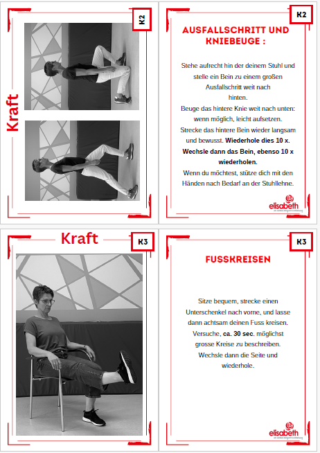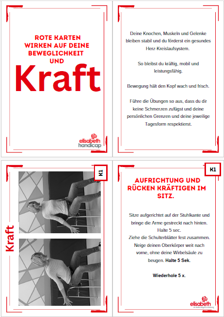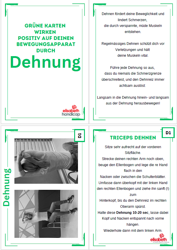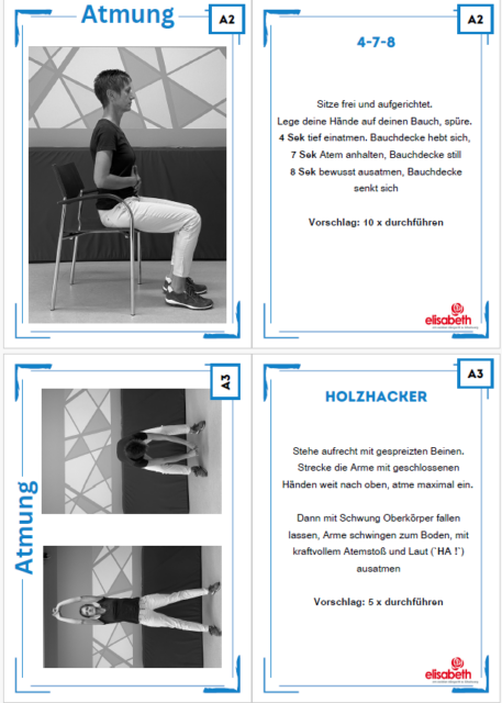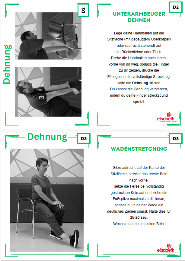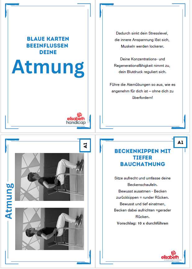 Zesummen hunn mir d’“bewegte Pause“ op gestallt. Dëst sinn 3 kleng Bichelcher mat jeeweils Übungen zu den Themen „Atmung“, „Dehnen“ an „Kraft“. D’Bichelcher sinn esou opgestallt,dass een, pro Säit, fir jeeweils eng Foto vun der Übung huet an hannendrop fënnt een dann eng kleng Erklärung, wéi déi jeeweileg Übung soll duerch gefouert ginn. De Groussdeel vun den Übunge ginn am Sëtzen gemaach, esou dass se och Rollstullgerecht sinn. Mir hunn eis fir eng Foto plus Text entscheed, fir dass d’Übung usech méi einfach ze verstoen ass, rsp. Dass een d’Ausgangspositioun gutt versteet/erkennt an d’Übung esou gutt wéi méiglech kann aus-/duerchféieren.